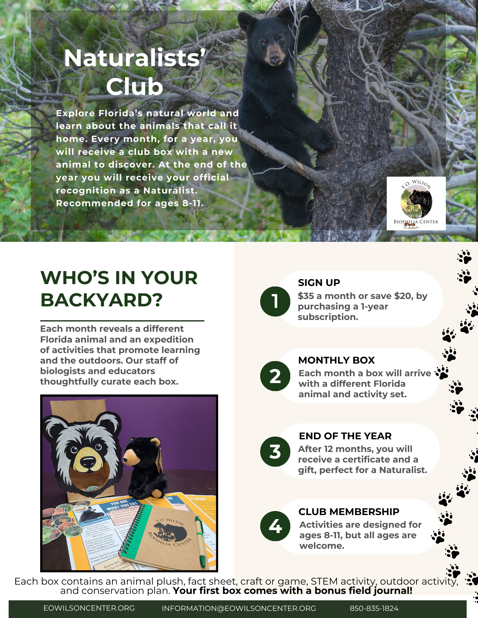 Discover the wonders of Florida’s wildlife with the year-long Naturalists’ Club! Each month, participants receive a new discovery box featuring hands-on activities, crafts, STEM challenges, and conservation lessons designed to spark curiosity and encourage time outdoors. At the end of the 12-month journey, members are celebrated with a certificate and a special gift.