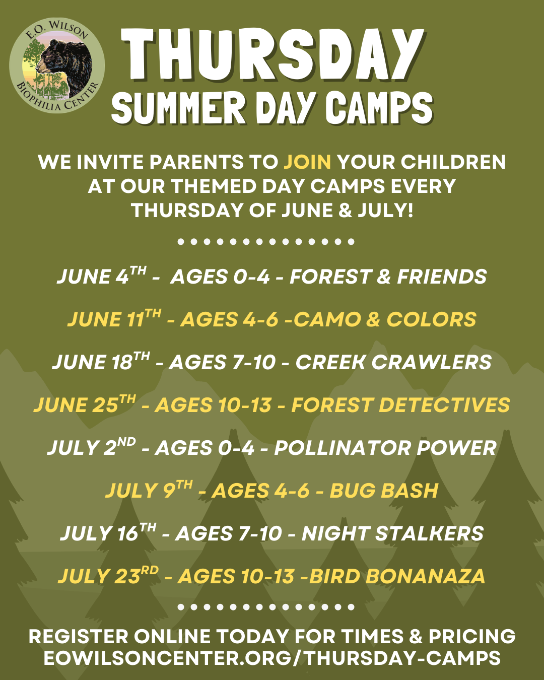 Each week will feature engaging, hands-on experiences including animal encounters, crafts, games, and themed nature activities that encourage curiosity, creativity, and a deeper connection with the natural world.